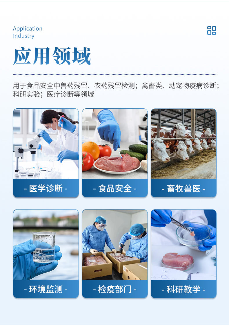 2、畜牧獸醫(yī): 動物疫病診斷、動物源性安全指標(biāo)檢測。