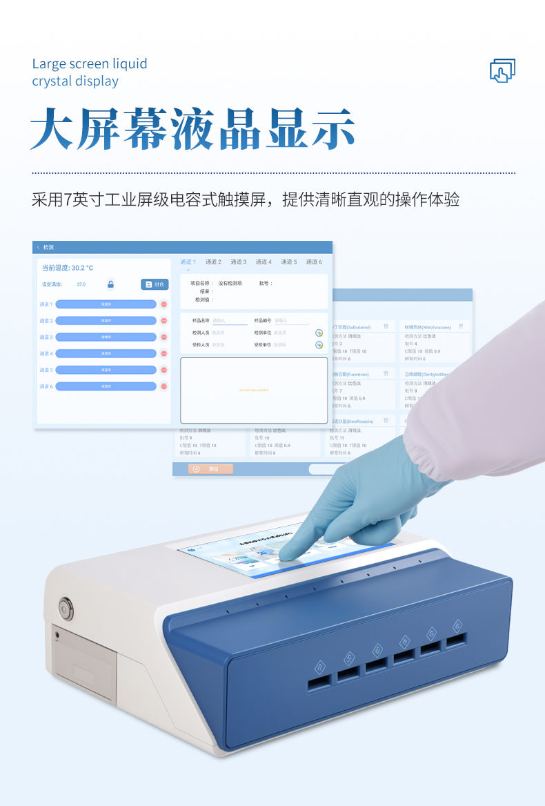 16、檢測結(jié)果:報(bào)告出檢測項(xiàng)目、被測物質(zhì)的結(jié)果、檢測單位、被檢查單位、檢驗(yàn)員、檢測時(shí)間、檢測限等信息可在觸摸屏上顯示,可通過儀器內(nèi)置打印機(jī)輸出
