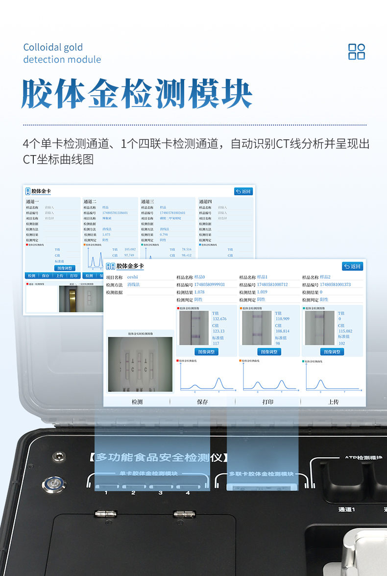 5、★膠體金檢測模塊,4個(gè)單卡檢測通道、1個(gè)四聯(lián)卡檢測通道,自動識別CT線分析并呈現(xiàn)出CT坐標(biāo)曲線圖。