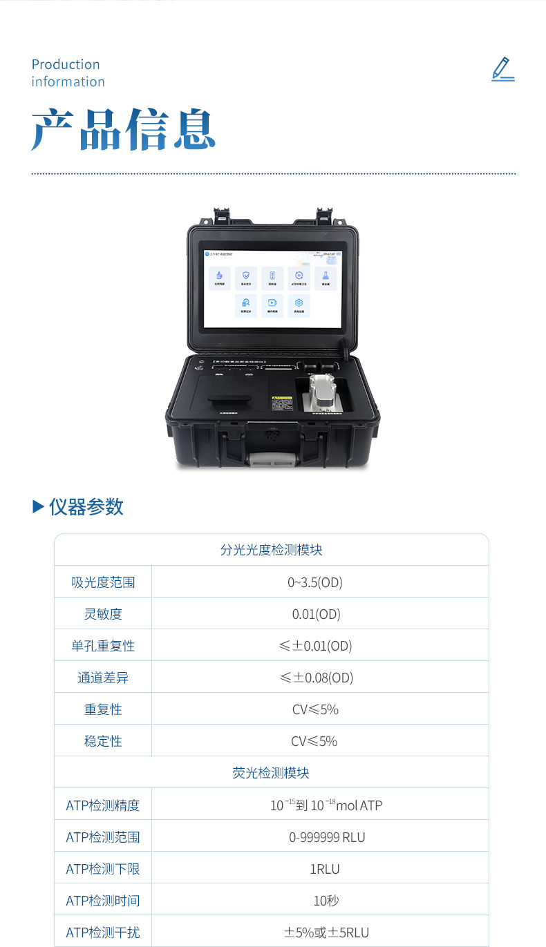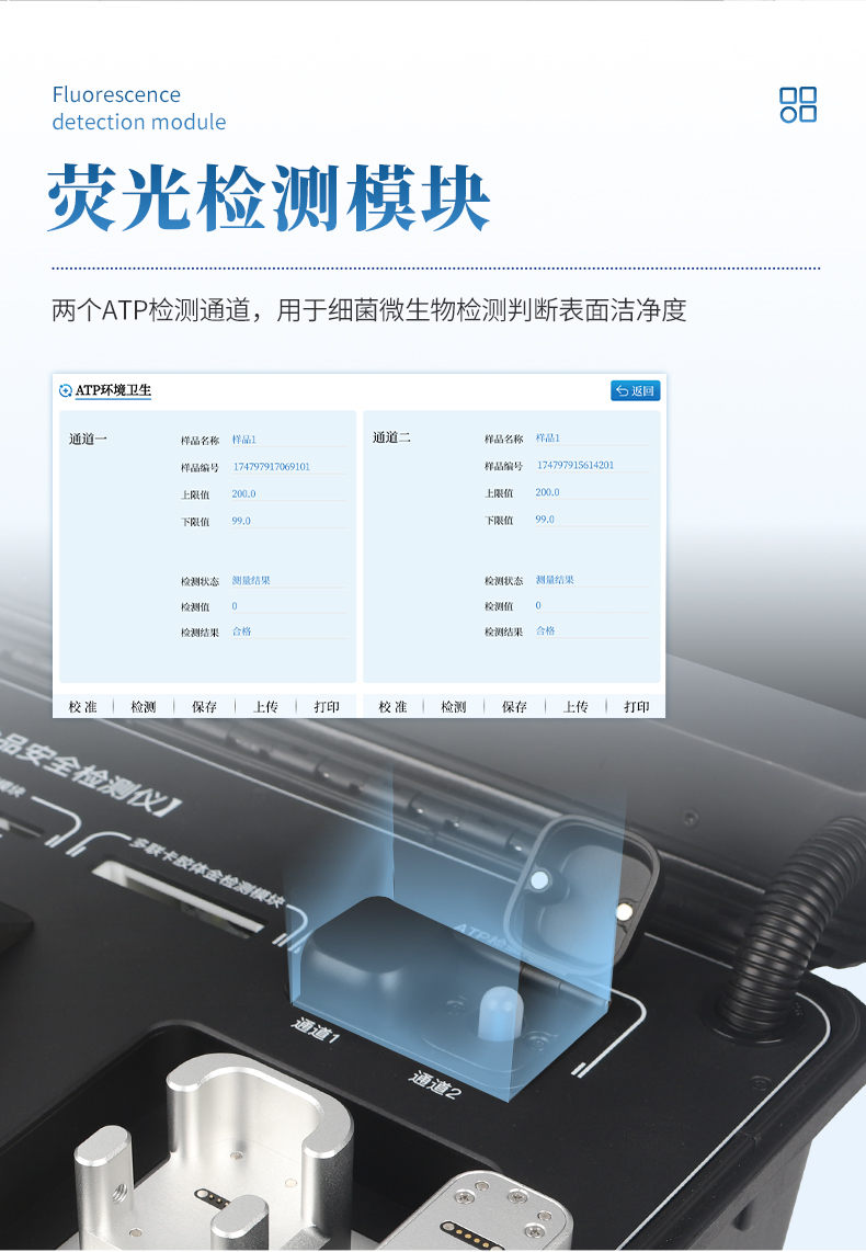 6、★熒光檢測模塊,兩個(gè)ATP檢測通道,用于細(xì)菌微生物檢測判斷表面潔凈度。