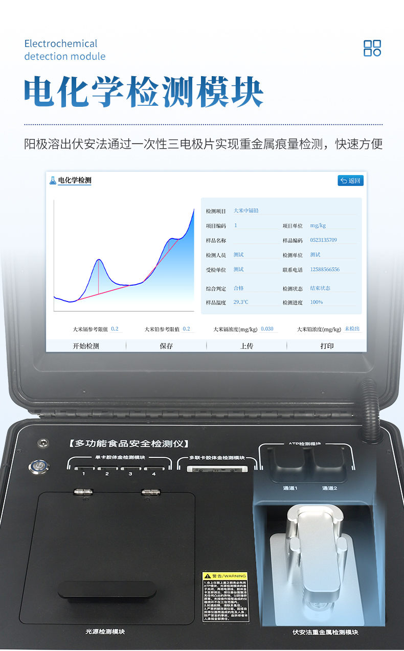 7、★電化學(xué)檢測模塊,陽極溶出伏安法通過一次性三電極片實(shí)現(xiàn)重金屬痕量檢測,快速方便。
