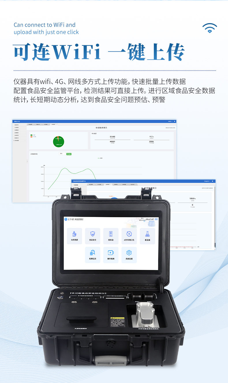 9、標(biāo)配食品安全監(jiān)管平臺,檢測結(jié)果可直接上傳。進(jìn)行區(qū)域食品安全數(shù)據(jù)統(tǒng)計(jì),長短期動態(tài)分析,達(dá)到食品安全問題預(yù)估、預(yù)警。