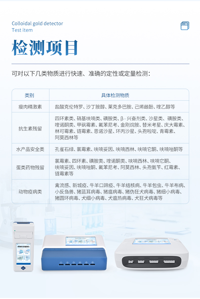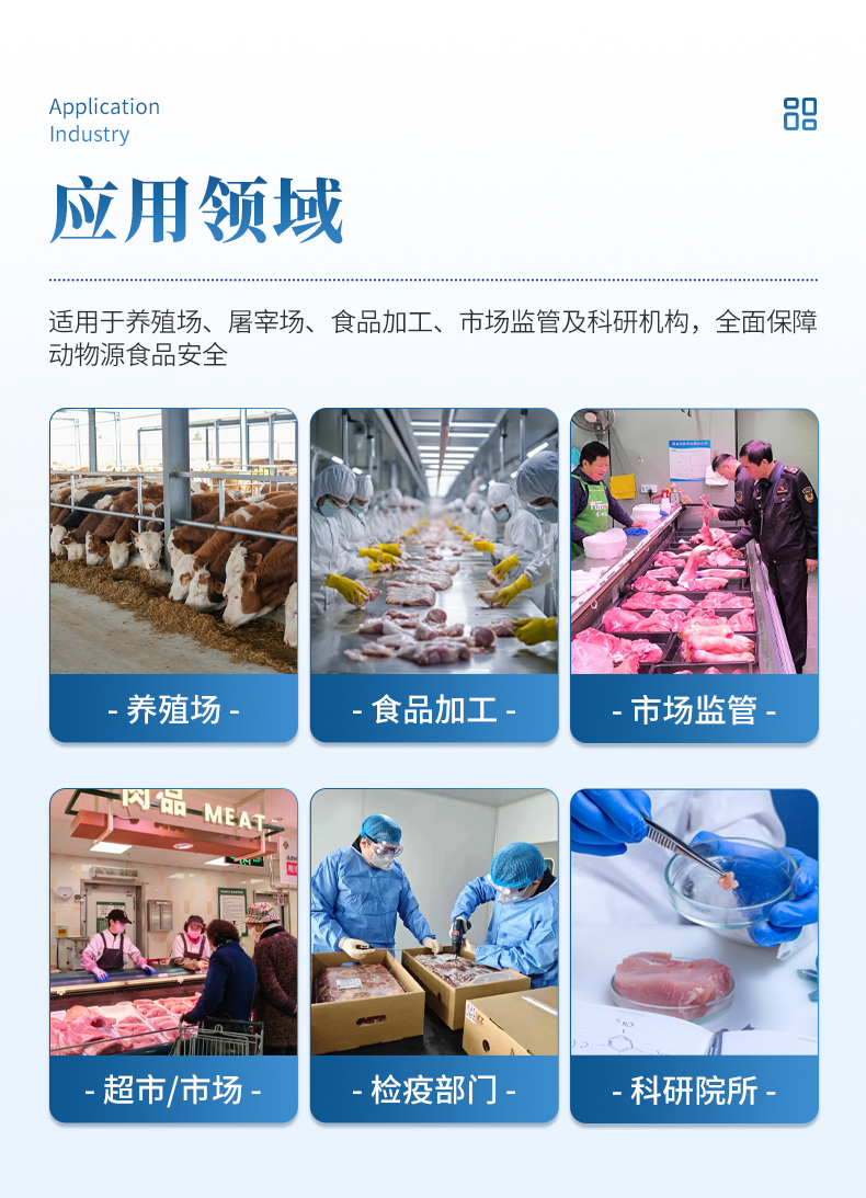 該獸藥殘留檢測儀適用于豬、雞、鴨、羊、牛、牛奶等畜禽肉產(chǎn)品中獸藥殘留,包括抗生素類殘留、瘦肉精激素類殘留和水產(chǎn)品有毒有害物質(zhì)的現(xiàn)場快速篩查定及定性定量檢測。 該多功能獸藥殘留檢測儀為集成化肉品安全快速檢測分析設備,可廣泛應用于畜牧養(yǎng)殖場、屠宰場、食品肉產(chǎn)品深加工企業(yè)、食藥監(jiān)局、檢驗檢疫部門、衛(wèi)生部門、高教院校、科研院所、農(nóng)業(yè)部門等單位使用。