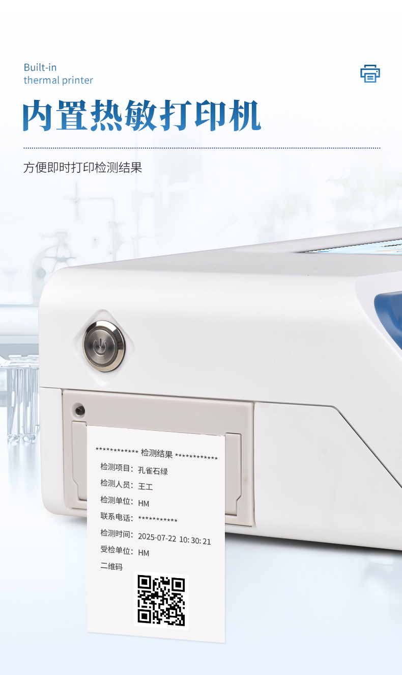 16、檢測結果:報告出檢測項目、被測物質(zhì)的結果、檢測單位、被檢查單位、檢驗員、檢測時間、檢測限等信息可在觸摸屏上顯示,可通過儀器內(nèi)置打印機輸出